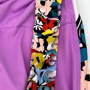 New without tags, factory panty liner still intact. This flattering plus-size swimsuit features a vibrant multicolor floral “Flower Field” print with high neckline, keyhole detail, and side ruching that enhances curves. Crafted from comfy 90% nylon / 10% spandex with wireless cups and removable padding, convertible adjustable straps, and ruffled trim for added flair. Measures 27″ in total length.