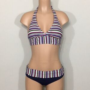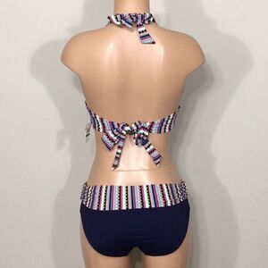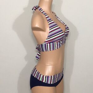 Beautiful multicolored print. Triangle top with wide band. Soft removable pads. Ties for easy adjustment. Bottoms have fold over flap with ruched sides. Navy with multicolored band. Fully lined with high-quality fabric.