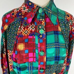 This gorgeous button down midi length shirt dress in a riot of hot pink, green and multi-colored overlapping plaids, two-tone polka dots and abstract geometrics. Funky green and gold buttons. Side slits.