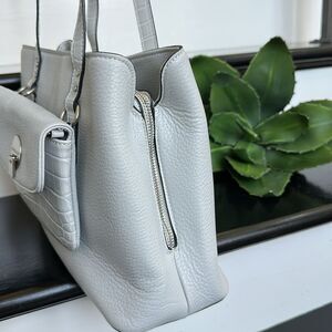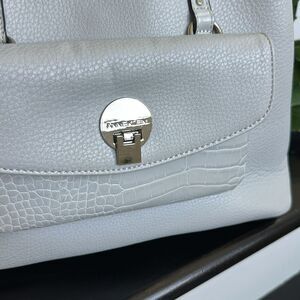 This Anne Klein 2-in-1 shoulder tote is the perfect blend of function and style, featuring a versatile design that transitions effortlessly from day to night. Crafted in a sophisticated light gray pebble and croc-embossed finish, this bag includes a removable front chain-link satchel purse that can also be carried as a chic clutch when desired.