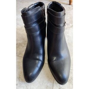DESCRIPTION: flex black zip-up ankle boot with two buckles on the outside.