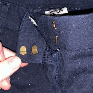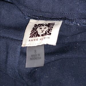 Anne Klein Navy Work Pants. Belt loops. Button, clasp, and zipper. Front and back pockets. Does have some fuzzies on inside and outside. Ankle length.