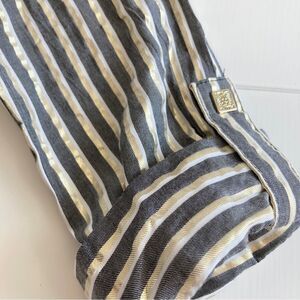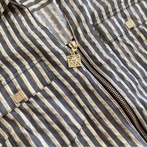 Anne Klein zippered 3/4 sleeve blouse with gray and gold stripes. Cute logo detail on zipper pull, sleeves and pockets. Classy professional look for travel, work, school, or a Zoom meeting. A definite statement that will get you lots of compliments!! Easy to dress up or down. Used but in great condition. Measurements in photos.