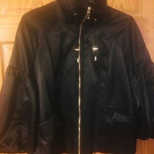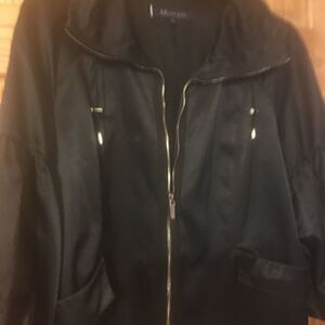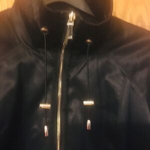 Anne Klein contemporary woman’s jacket. Zipper and collar goes all the way up to cover entire neck. Two sude pockets, a shaped, silky black material.