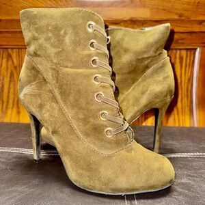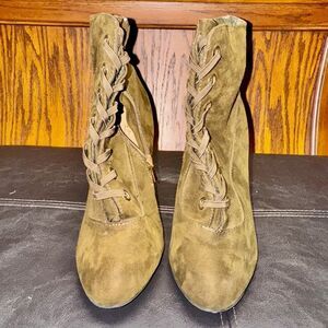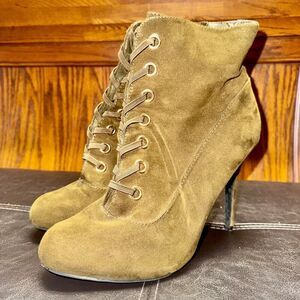 Step out in style with these Anne Michelle Faux Suede Lace Up Heeled Mid Calf Boots! These boots are in a beautiful green color and a size 10. The faux suede material gives them a luxurious look and feel, while the lace-up design adds a touch of edginess. The heel provides the perfect amount of lift, making them comfortable enough to wear all day or night. These boots are perfect for any occasion, whether you're dressing up or dressing down. Don't miss out on the chance to add these gorgeous boots to your wardrobe!