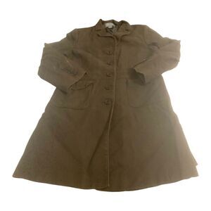 Ladies super cute brown heavy denim button down trench coat by Anne Taylor. Has a white spot on sleeve as shown in picture. CN be removed with some TLC. Otherwise good condition. Ladies size large.