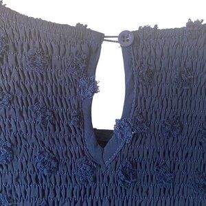 Annebouti Navy Dress Swiss Dot Flare Sleeve Flowy Smocked Bodice Ruffle Hem XL