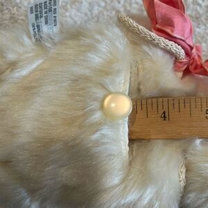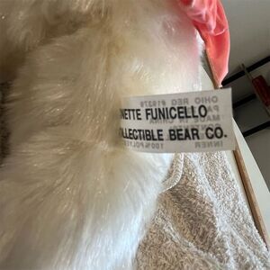Keywords: plush bear, Annette Funicello, collectible bear, white bear, limited edition, floral accent, pink ribbon, purse bear, soft toy, vintage bear, new with tags, modacrylic, polyester, 10-inch bear, snuggly bear