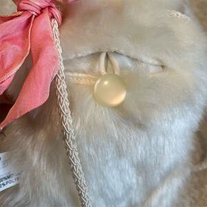 Meet your new cuddly companion from the Annette Funicello Collectible Bear Company Plush purse. This adorable 10-inch white plush bear is crafted from soft modacrylic and polyester, making it perfect for snuggling. Adorned with a charming floral accent, a pink ribbon, and a cute strap, this limited edition bear is a delightful addition to any collection. It even comes with its original tags and a sweet "Penny" purse. Whether you're a collector or just looking for a new friend, this bear is sure to bring joy. New with tags, like new vintage mint condition.
