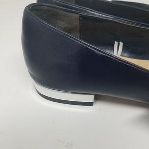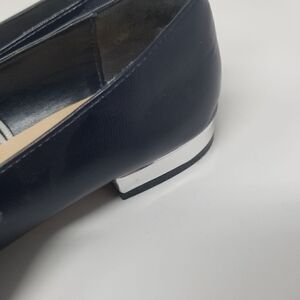Very good used condition. Shoe is 10" in length, which is a womans size 9.5. Navy blue faux leather. Very cute flats. Nanette Lapore.