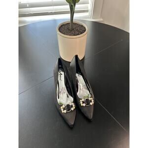 These shoes are absolutely beautiful, classy & elegant. They also have a low heel for comfort. You won't have to take these off during the middle of the event. Elevate your formal or evening look with these stunning Annie black satin heels. Brand new in the box, they feature sparkling diamond embellishments on the toe, adding a touch of glamour to any outfit. Perfect for weddings, parties, or special events, these heels combine elegance with timeless style.