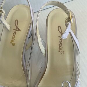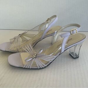 Annie Clear Heel Lavender Sling Back Size 7M. An adorable pair of heels with a vintage look. The glue that holds the insert has softened a bit, but does not affect the wearability. It was hard to get a good photo of that, but you can see it a little bit in a couple of the photos. Other than that they are in really good condition.