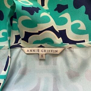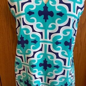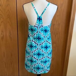 Beautiful silk halter print dress with bright colors of turquoise, navy and white. Dress is lined. Approximate measurements laying flat: bust 17” across from armpit to armpit and length from shoulder is 33”. Dress is in excellent like new condition.