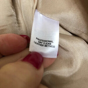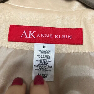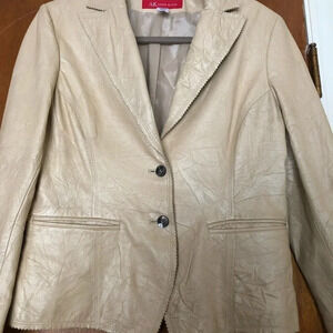 Annie Klein Crinkle Texture Leather Jacket, Open V-Neck Lapel Collar, Front Flap Pockets, Turned Up Cuffed Sleeves, With Scallop Edge Design Around Collar, Lapels, Front And Back Of Jacket And Pockets, Pale Gold With 2 Button Closure, Size: M, Excellent Condition.