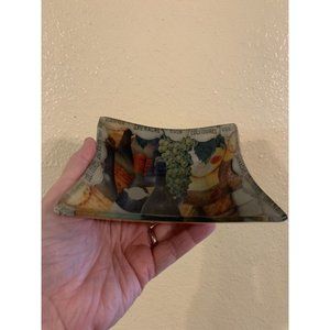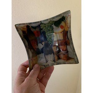 Annie Modica Gold Leaf Bottom Trinket Tray, Rare layered glass, AM French Collection. Wine bottle, French text, full color design, beautiful in the light.