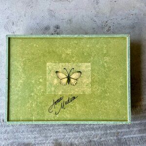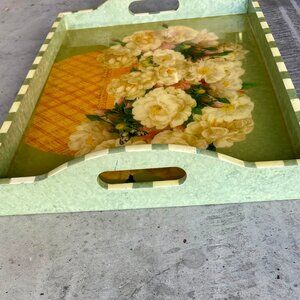 Annie Modica rectangular serving tray featuring a woven basket with overflowing roses. Hand crafted in wood with a lacquered resin finish. Signed on the back.
