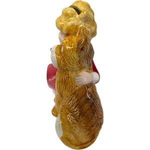 In the whimsical world of Annie, a tale of friendship and adventure, this ceramic coin bank captures the innocent bond between a curly-haired girl and her loyal dog, Sandy. Crafted by Applause in Taiwan in 1982, it offers a nostalgic touch to any collection, preserving memories and coins alike.