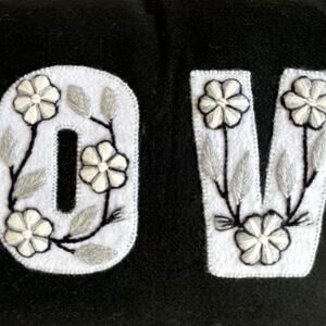 embroidered design, whipstitch trim