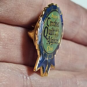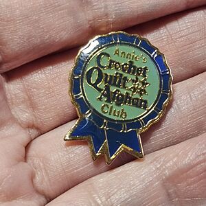 Annie's Gold Tone Blue Enamel Crochet Quilt & Afghan Club Lapel Ribbon Pin
