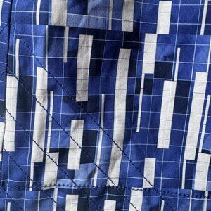 Geometric print in sapphire/white/black. 5 - rows of royal blue top stitching on the diagonal on both side at both front & back.