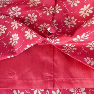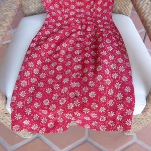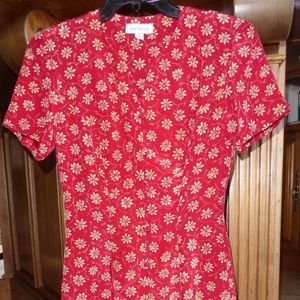 red with red lining and fabric covered buttons. Flattering fit with darts. Great for work or out for dinner, all season dress.