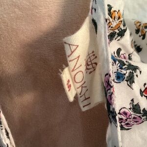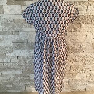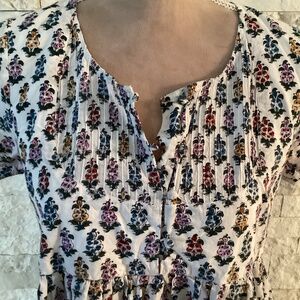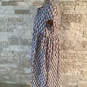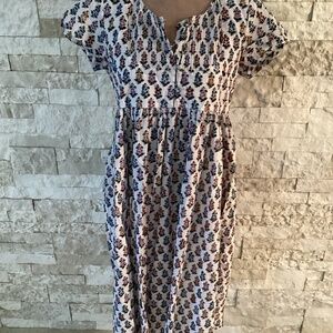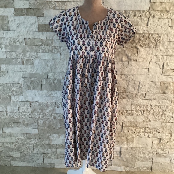 This pretty dress is an Anokhi dress in a multi-colored, small-scale floral or paisley print. Anokhi is an Indian brand known for using traditional hand block printing techniques on 100% cotton fabric. The dress has a midi length, short sleeves, a V-neckline with smocking or pintuck details on the bodice, and an empire or slight empire waist with gathering.