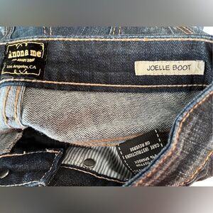 Anoname Dark wash Joelle Boot jeans size 25. Cotton spandex blend, 5 pocket style. Feathering and distressed, two back pockets with buttons. Approximate measurements are waist 14”, rise 7”, inseam 33”.