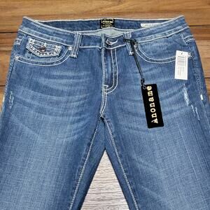 You're viewing a pair of Anoname Joelle Boot-Cut Denim Jeans, size 29. These jeans are new with tags, so they're in excellent condition and ready to wear! The boot-cut style is flattering and versatile, perfect for dressing up or down. The 'bling' detailing adds a touch of sparkle and personality to your outfit. Don't miss out on adding these stylish jeans to your wardrobe! Comes from a smoke free home.