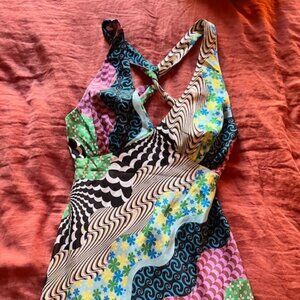Vibrant midi dress with a mix of patterns. Features a halter neckline. Perfect for a bold statement.