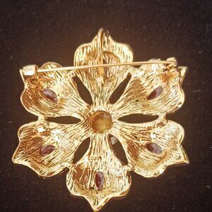 This beauty is set in gold-tone metal with red and clear rhinestones, and a surprising green center rhinestone !