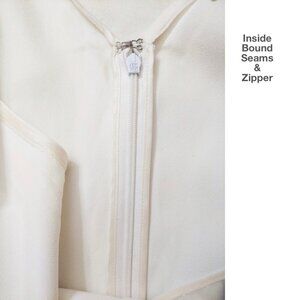 Beautiful drape, movement and construction. Zipper down center back with eye and hook closure at top. Fully lined with slip that is held in place with snap straps at shoulder top. Viscose/Elastane blend (see label pic for exact fiber content). Made in Italy.