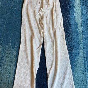 Textured, cream colored, loose-fit pants with elasticated waist and side and back pockets.