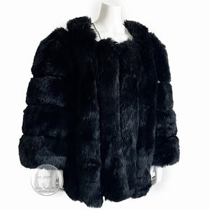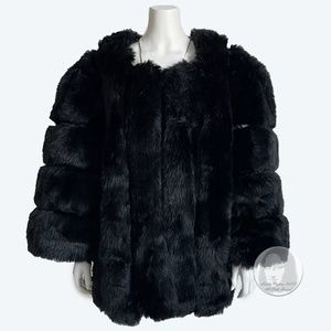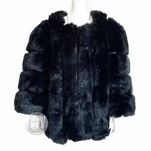 Preowned faux fur rockstar bubble style jacket by Anrabess. Made from an incredibly soft and shiny black faux fur separated by bands of black fabric, this bubble style coat looks rock-n-roll fabulous!