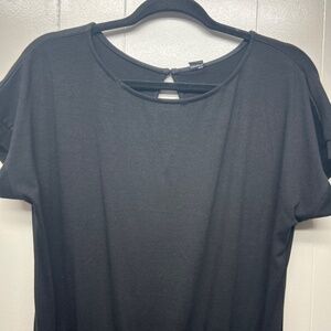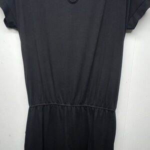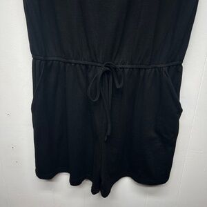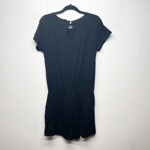 Anrabess women's black romper. Round neck. Short sleeves. Keyhole in back. Elastic waist with drawstrings. Side pockets. Stretch. In good used condition. No stains, tears or holes.