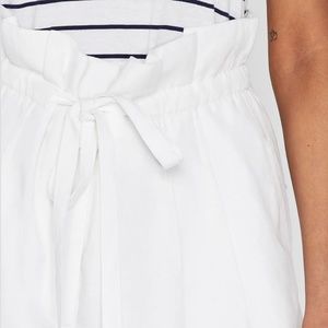 Drawstring paperbag waist; two side pockets; sewn-down pleats; two back pockets