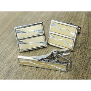 An elegant Anson Cufflinks Neck Tie Clip Set in a chic two-tone brushed style. Perfect for enhancing your vintage tux shirt dress suit with a touch of silver.