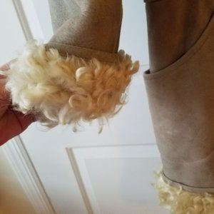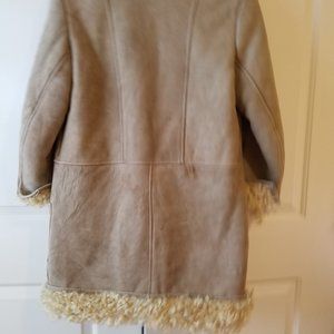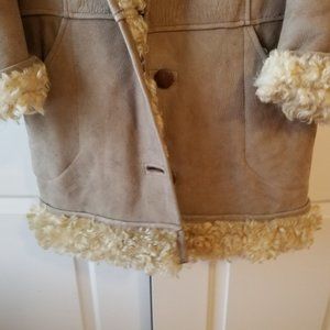 100% lambskin. Outside - suede, inside - curly natural lamb fur. The coat is fully lined in the curly lamb including sleeves. And in front, and back, and sleeves inside - from fur. Even the pockets built into the sides are made of fur inside. Seam at the waist. High (if fastened on the top button) collar. Very stylish. Fashionable. Warm. Surprisingly light weight and super comfortable.