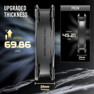 * 30mm Thickness:Increasing the thickness to 30mm makes the contact surface wider and air inlet area bigger between the fan and the chassis, min 19.24 CFM ~max 69.86 CFM.