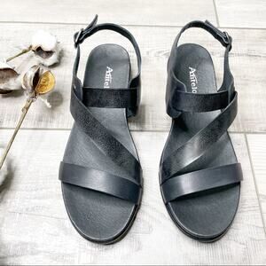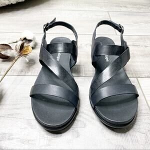 Design: Leather sandals, strappy crossover style, open toe, ankle strap with buckle closure, cushioned footbed