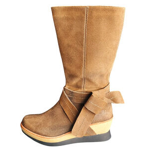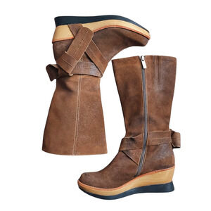 Eye-catching and a little funky, these platform/wedge roughout suede boots are perfect if you like to wear a conversation piece. Full side zip for easy on-off, roughout suede for extra durability, and a strap knot floweret for a feminine touch.