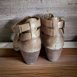Antelope khaki leather booties with hardware and Velcro closure for 2 straps. Comfy 2.5" stacked heel. Brand: Antelope