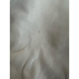 It is made of soft butter light beige colored leather and features a gathered top with a shoulder strap, resembling a hobo or slouchy shoulder bag style.