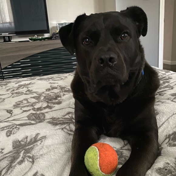 This playful black dog is ready for fun with its vibrant tennis ball. Perfect for energetic playtime.