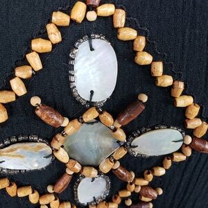 Beaded around the front of the neckline and beaded design in the middle of the chest