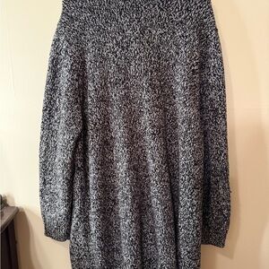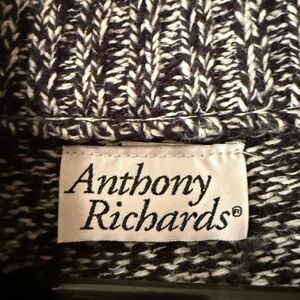 This Anthony Richards cardigan sweater features a sophisticated black and white color scheme, perfect for adding a touch of elegance to any outfit. The long, knit design extends below the waist, offering warmth and style. Its textured fabric provides a cozy feel, making it an ideal choice for cooler days. Not 100% sure of the size