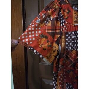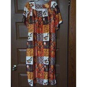 Anthony Richards House Dress Mumu Nightgown Orange Brown White Fall Size Medium. Item is new without tags. Measures 42.5 inches long, pit to pit is 24 inches laying flat. 100% polyester, item has pockets and stretches. All measurements are approximate. This is a fall pattern with leaves, acorns and some checked pattern.