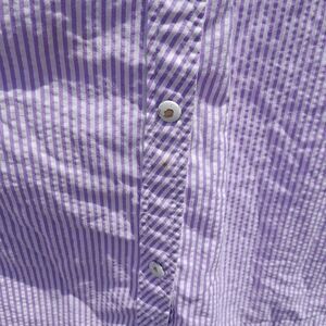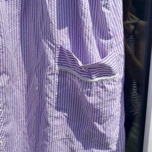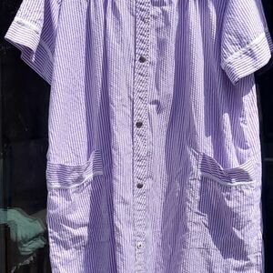 Charming dress with purple stripes and butterfly details. Button front with handy pockets.