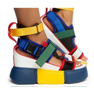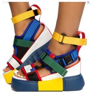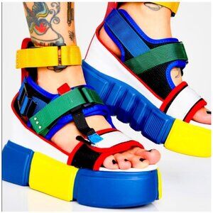 A bold and colorful addition to footwear collections, these platform sandals feature a trendy multicolor design, velcro straps, and a chunky sole for maximum impact.