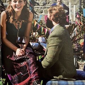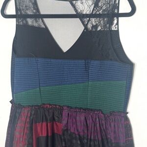 ahajan is a gorgeous sleeveless dress with a unique print and lace details! From the Anthropologie website: "Inspired by the medieval architecture of New Delhi, Indian designer Niki Mahajan's pieces are marked by rich color palettes, intricate woodblock prints and hand-embroidered details." The bodice has a v-neck with princess seams and a quilted and color-blocked navy blue and forest green fabric with black floral-patterned lace on the shoulders with an accent on the back and black mesh netting. The waist has pleating and a ruffled trim and the skirt is midi length with a variety of different abstract and geometric patterns in black, purple, deep red and gray. A unique dress in a flattering cut and style and in a nice modest length too. Invisible side zip closure. Fully lined. Silk/nylon blend with a polyester/cotton blend lining. Rare and hard to find! Size 12. Originally $248.