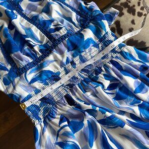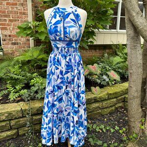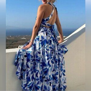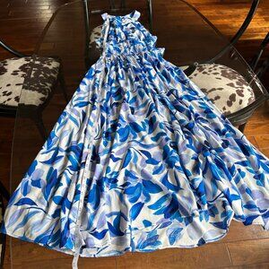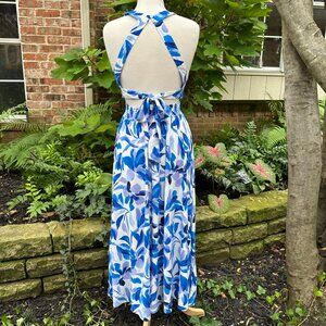 Anthropologie Able The Label Rumi Halter Floral Maxi Dress. Women's size medium. White rayon with blue and lavender floral leaf pattern. Flowy and elegant. High halter neck with cutout embroidered crosshatch details on halter. Smocked elastic waist. Adjustable tie at back with two button neck closure. High front slit. No pockets. Unlined. Feminine and perfect for your Santorini vacay, as resortwear or an elegant brunch with your girls. Excellent, like-new condition. No visible flaws. Clean, smells good. Smoke-free home.